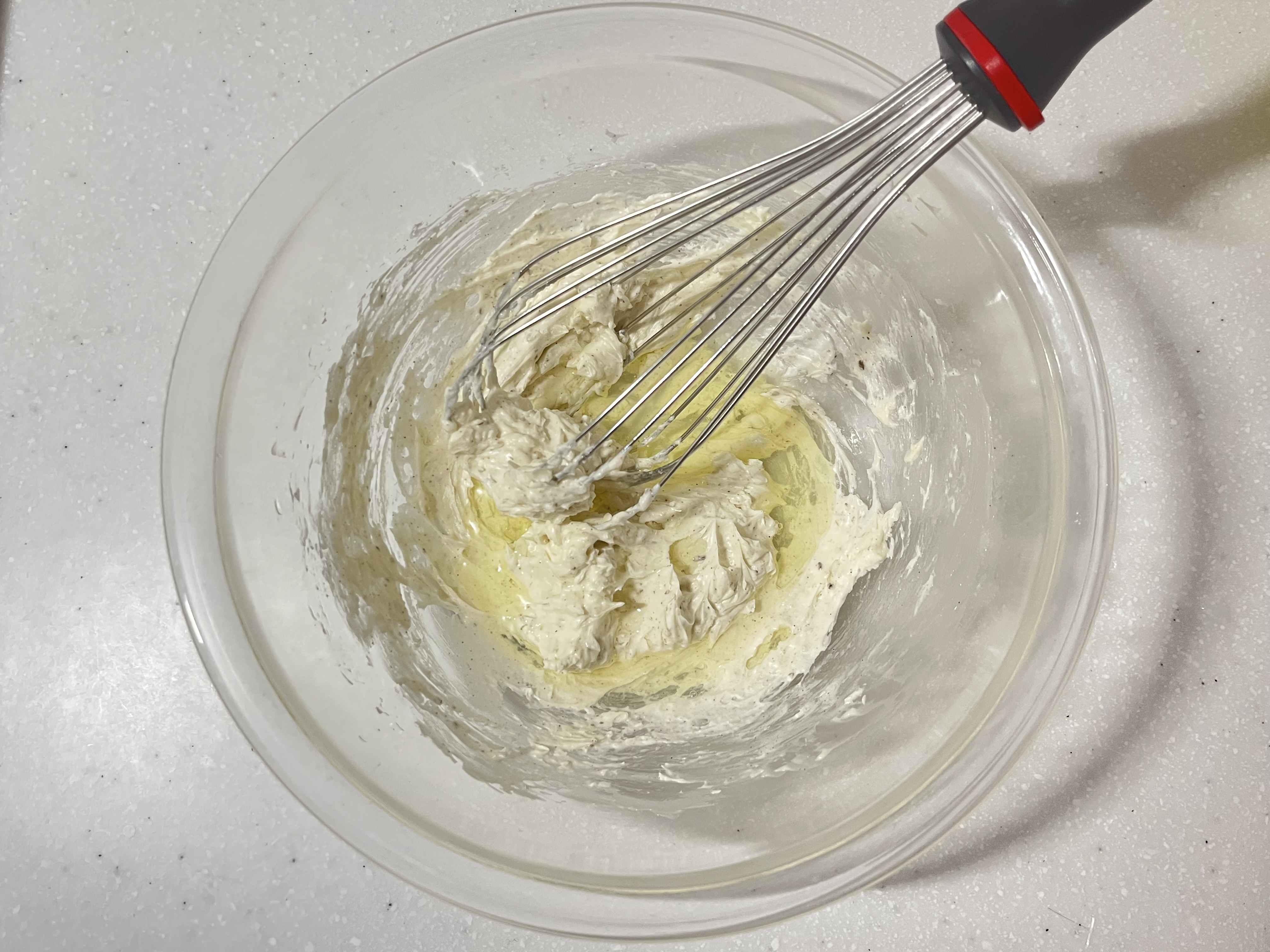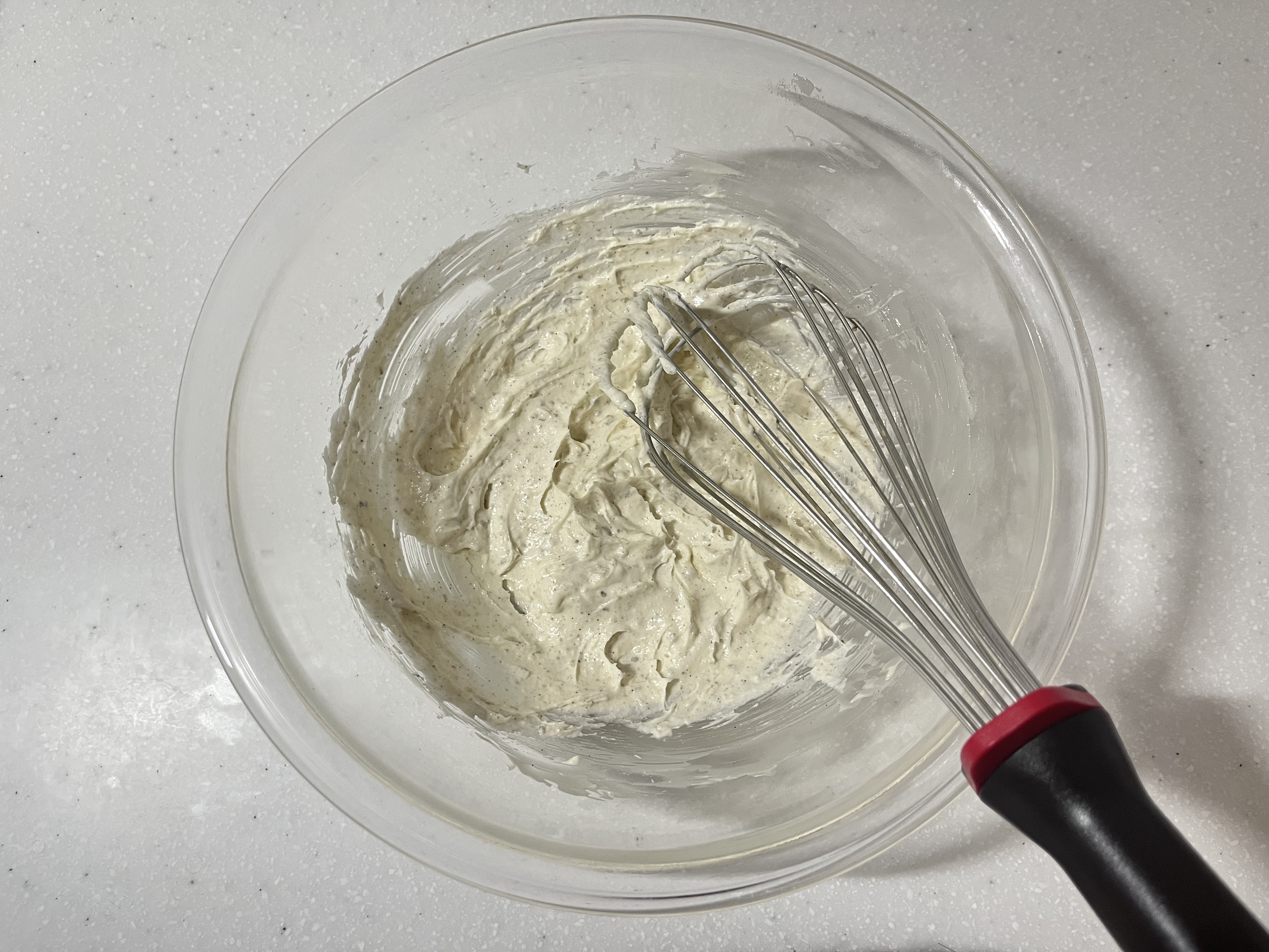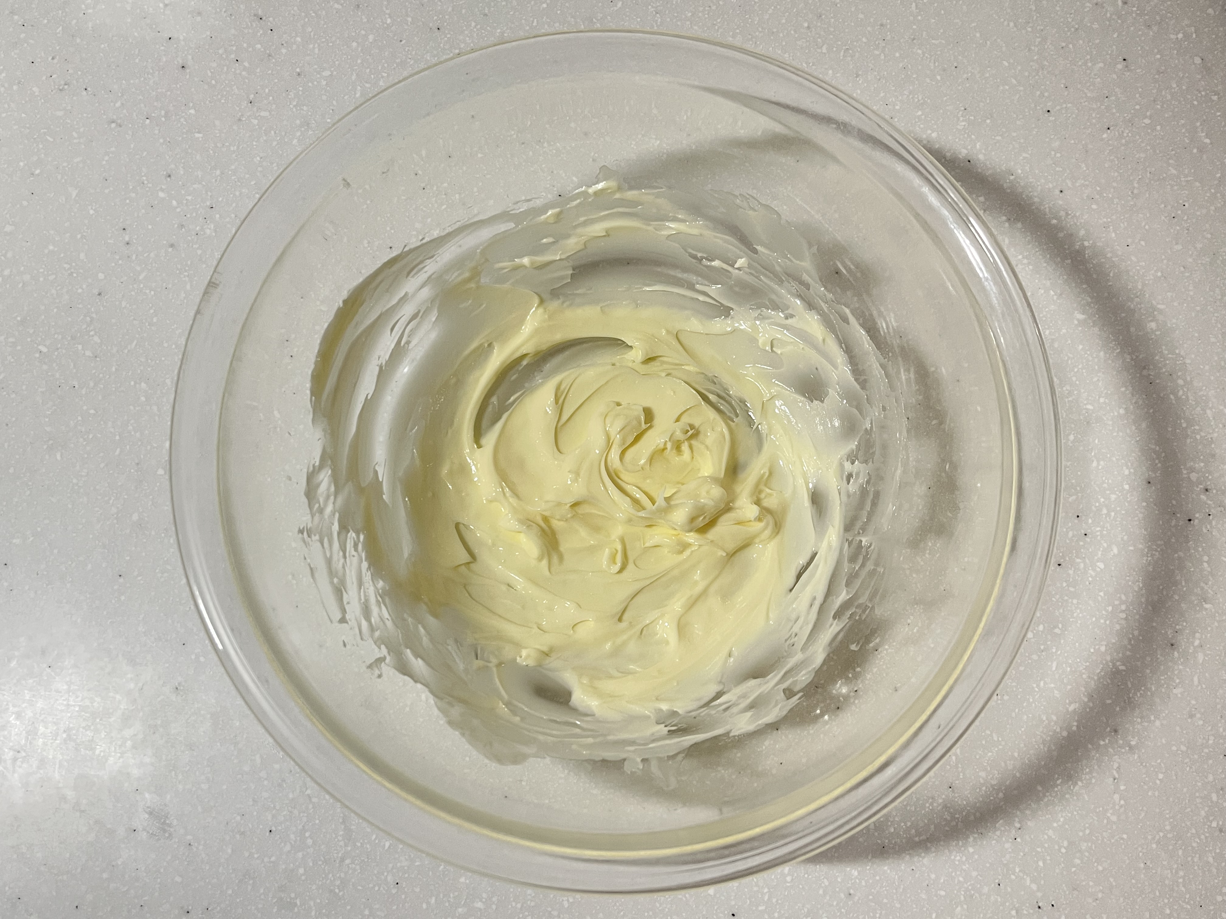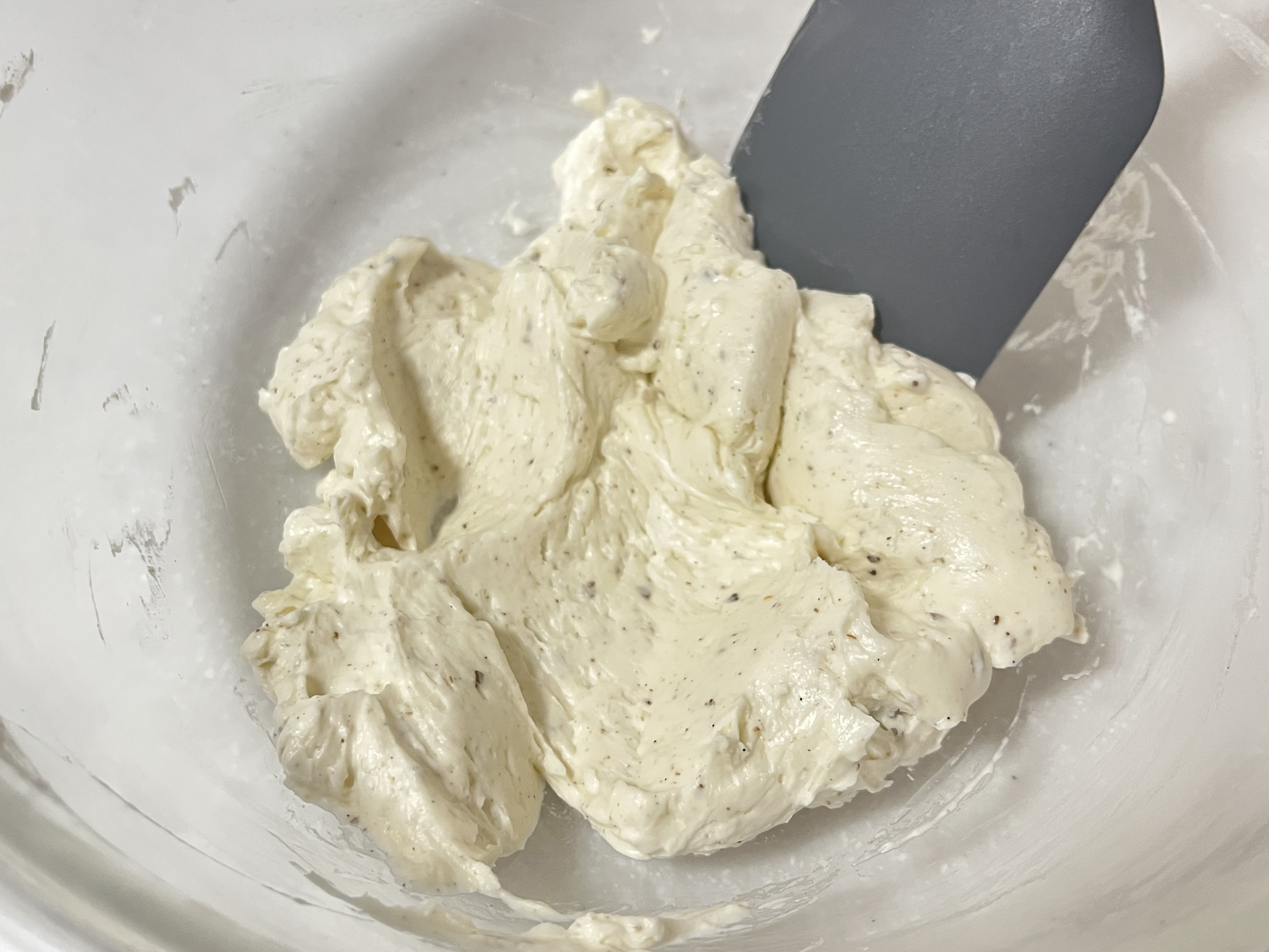 ![]() | 4.ゴムベラで馴染ませる 一度ゴムベラで周りから生地を集め、均一になるように馴染ませる。 |