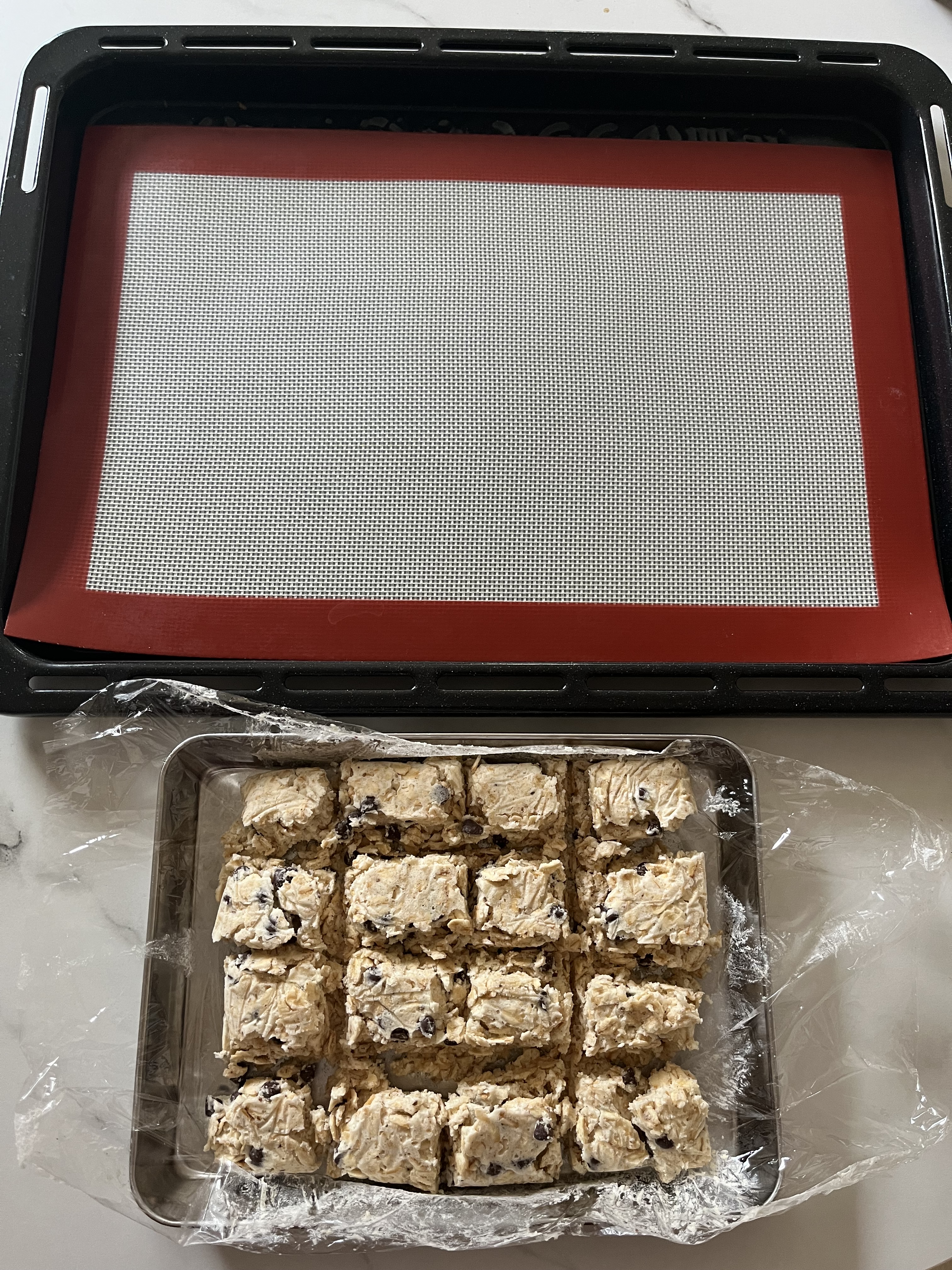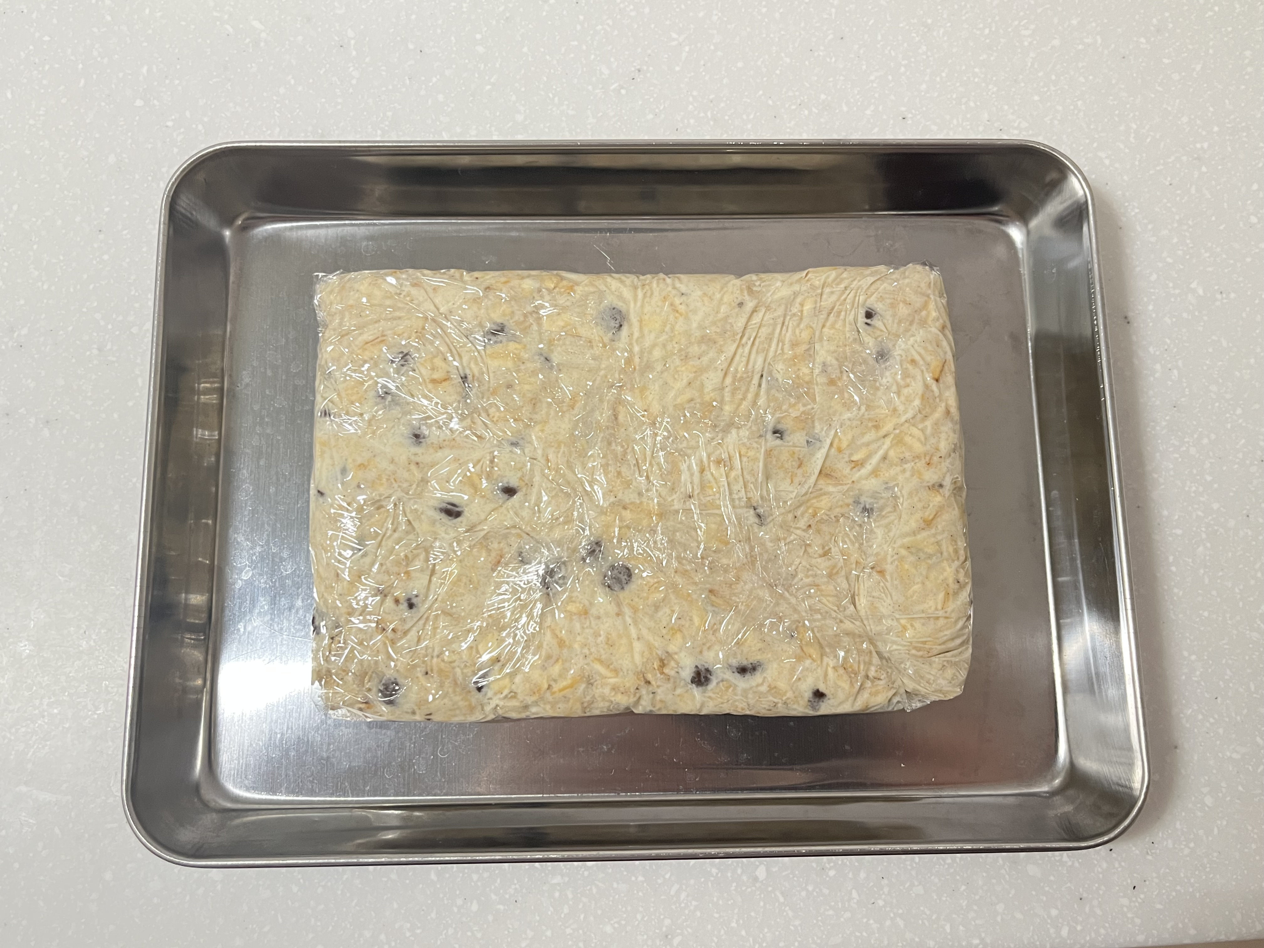 ![]() | 5.粉類・具材類を加える アーモンドプードル・オートミール・チョコチップを加え、切るように混ぜながらまとめていく。 |