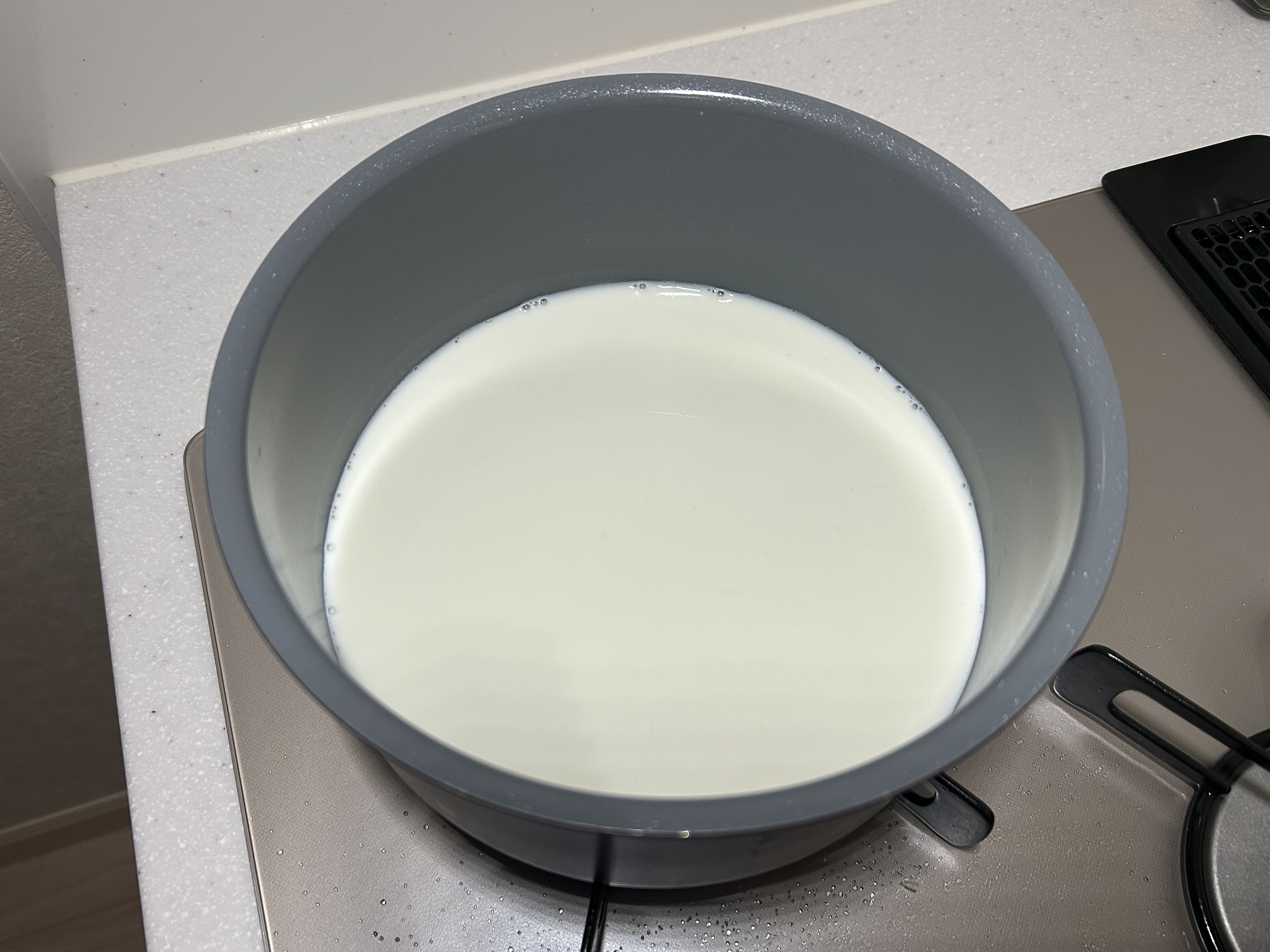 ![]() | 2.牛乳を温める 牛乳にグラニュー糖を加え、グラニュー糖が溶けるまで温める。 |
