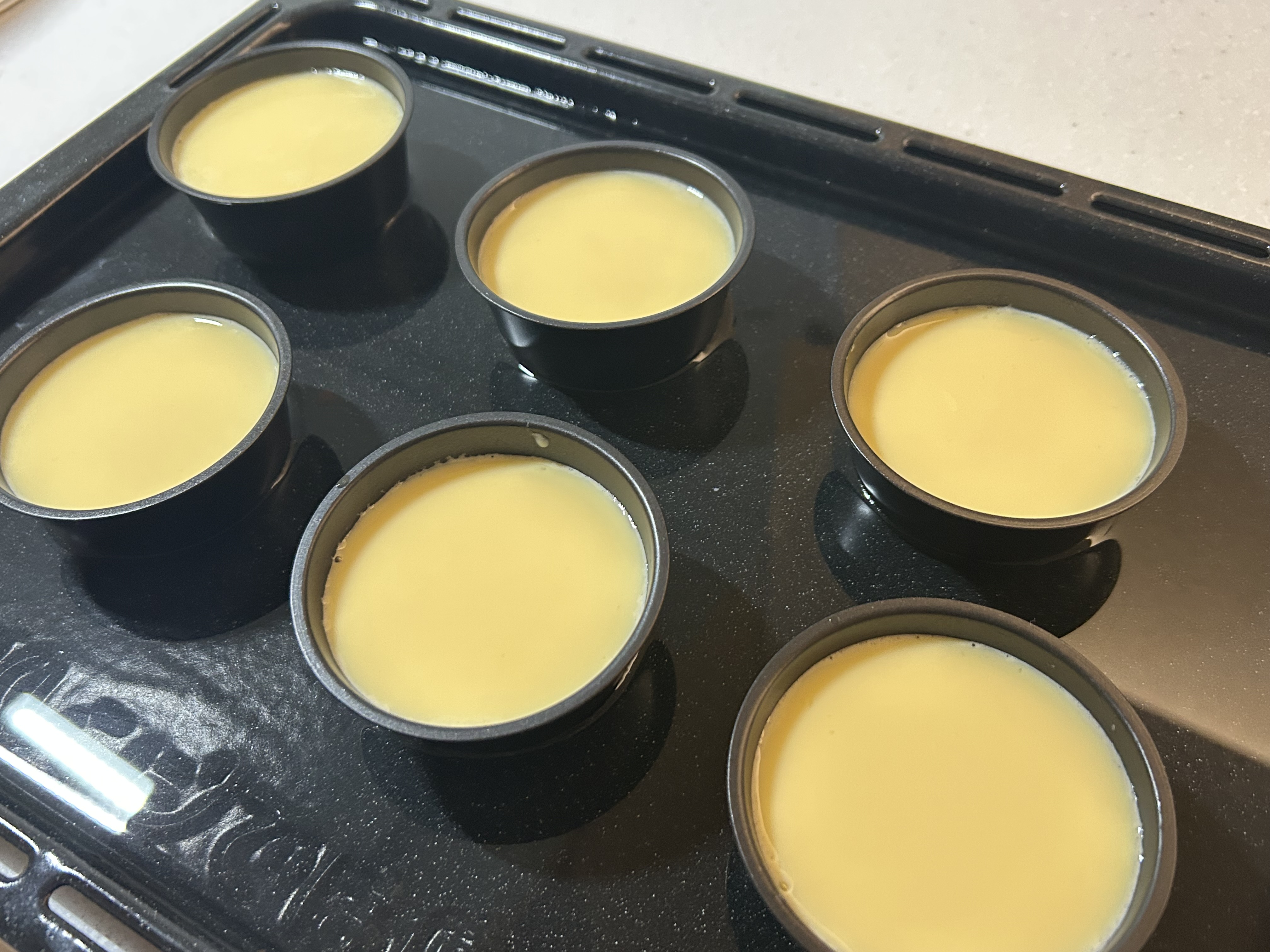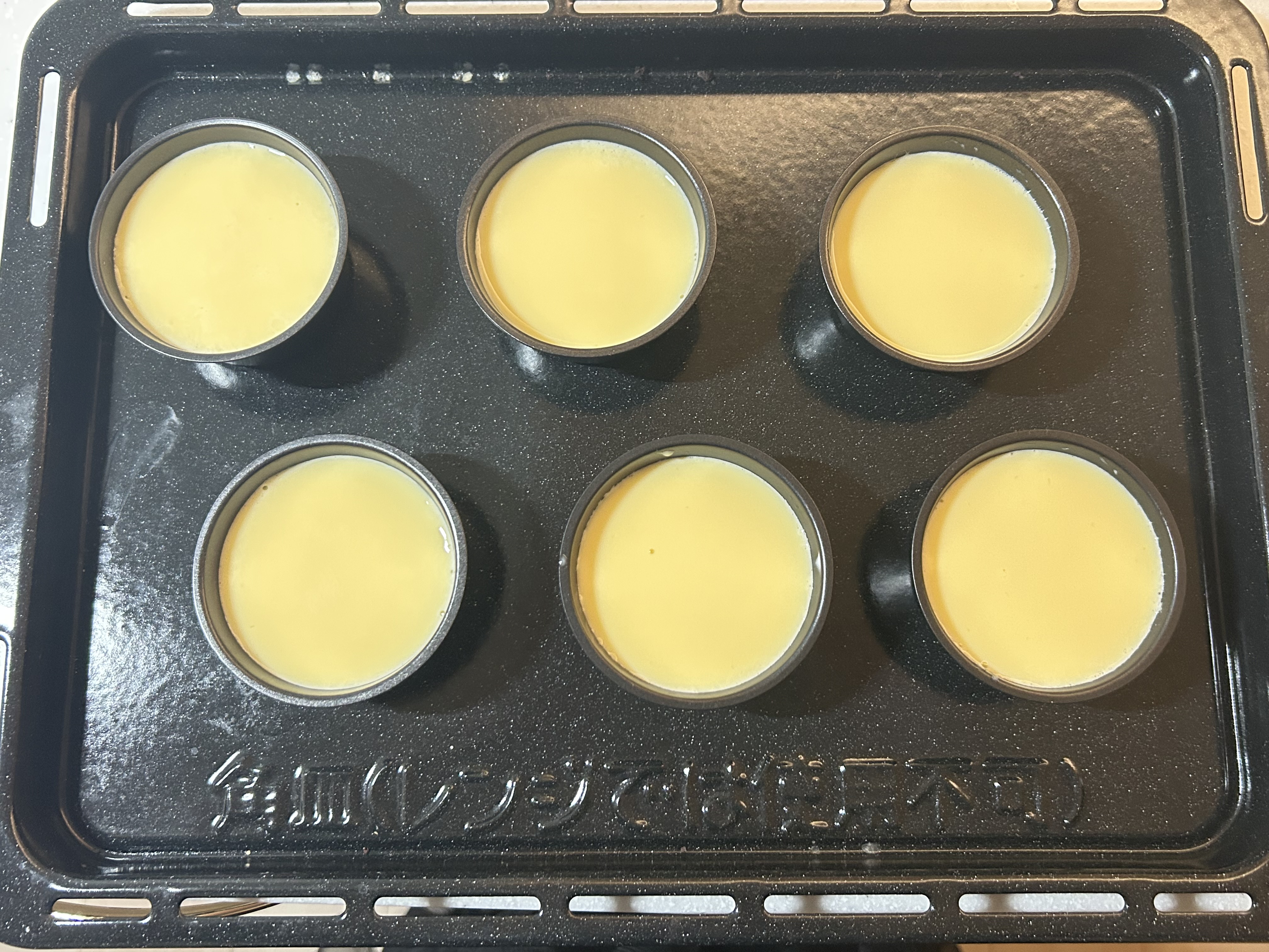 ![]() | 5.焼成する お湯を鉄板の半分くらいの高さまで注ぎ、150℃で11分〜12分湯煎焼きする。 |