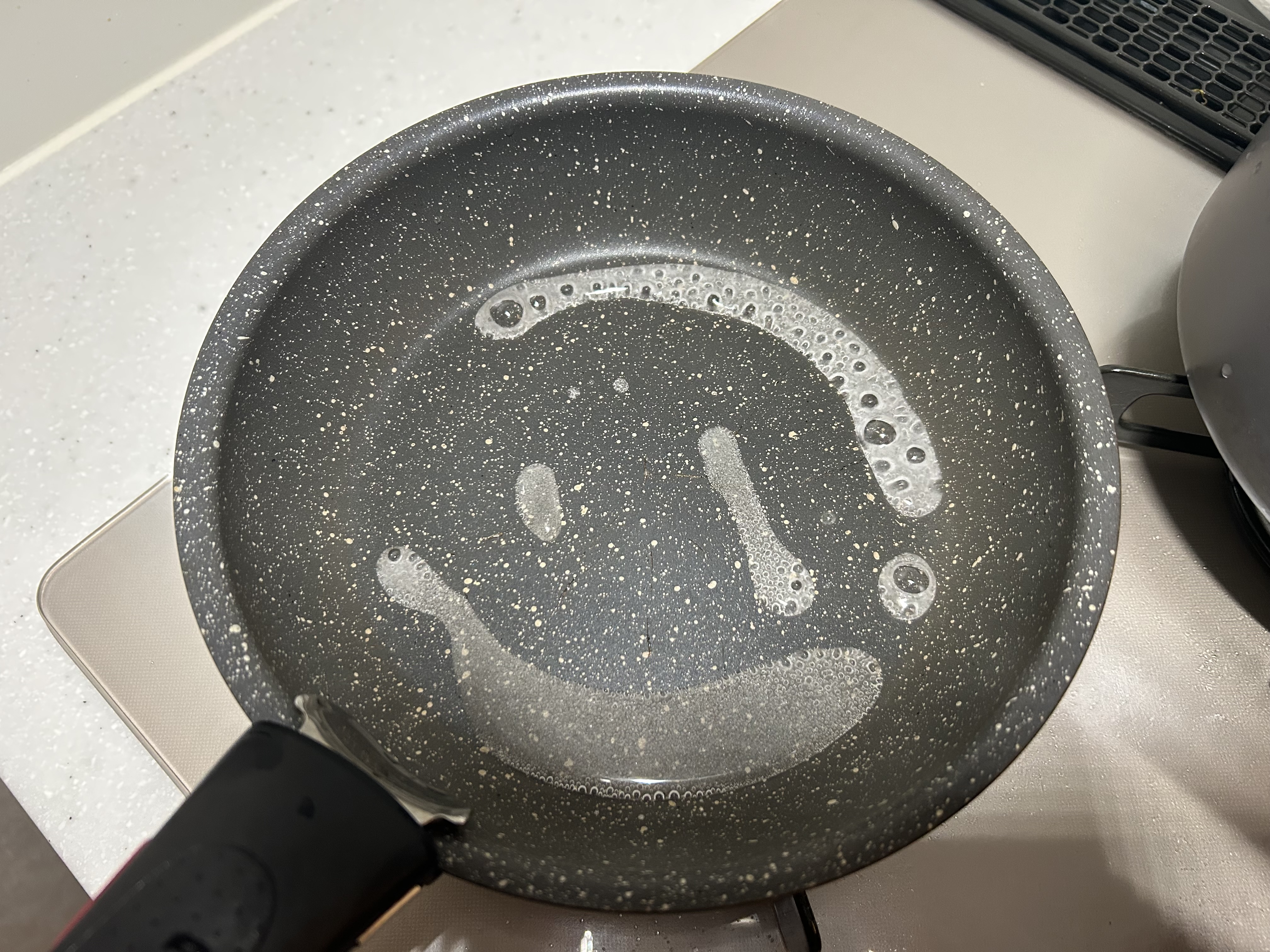 ![]() | 7.水を加えて止める グラニュー糖が煙が出るくらい焦げてきたら、水を適量加えて火の入りを止める。 |