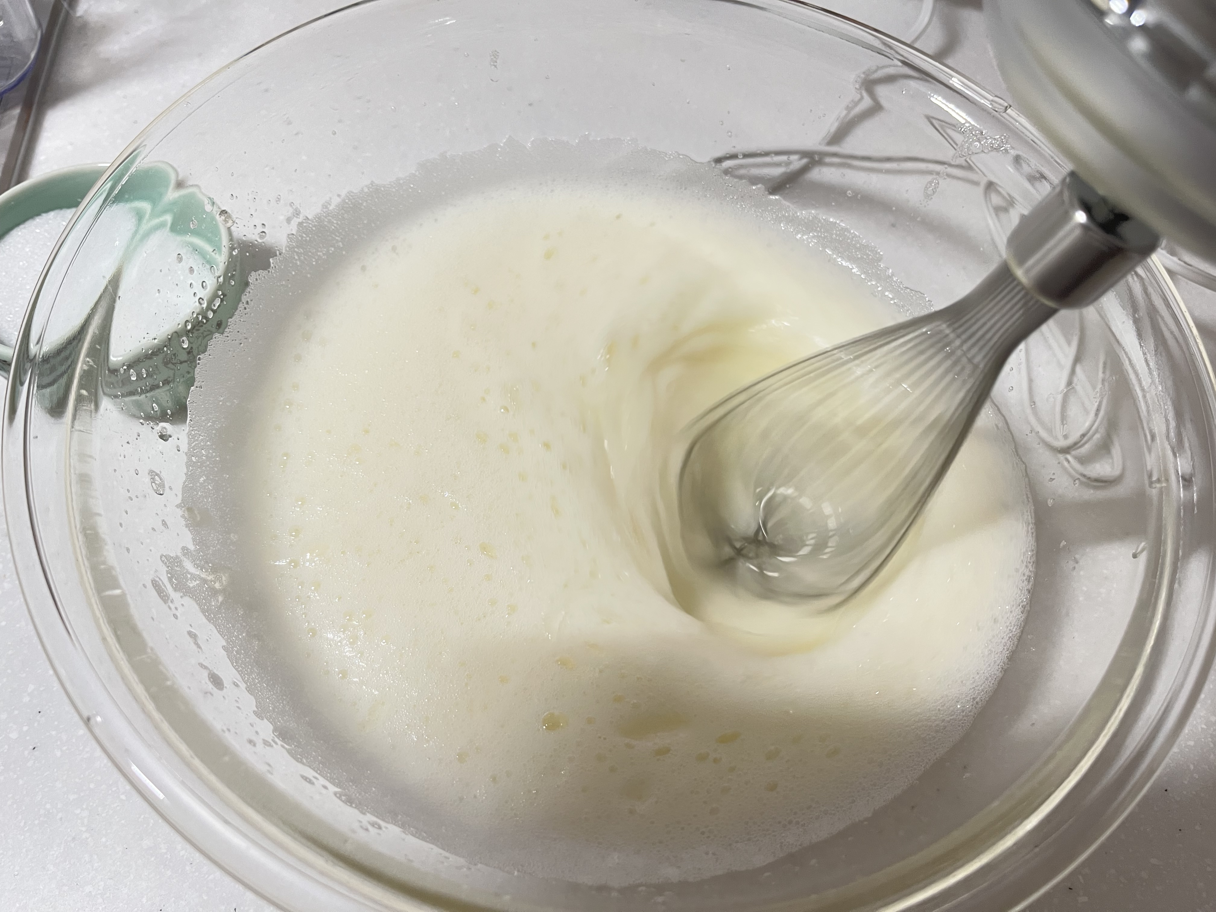 ![]() | 4.最後のグラニュー糖を加える グラニュー糖が馴染み、ツヤが出て先が折れるくらいのツノが立つようになったらOK! |